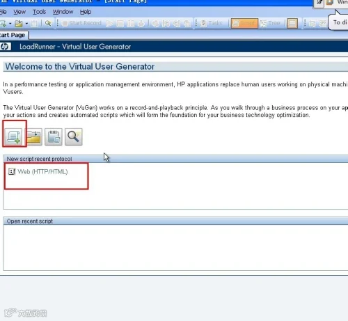1.点击LR进入后点击Create/Edit Scripts进入下图所指界面,一张白色的纸有一个绿色的“+”号的一个图标和下的“Web(http/html)”都可以点击进行创建。