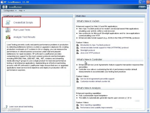 安装完成LoadRunner后进入LoadRunner的初始界面,先对这个界面做一个简单的介绍:在界面左侧有三项分别为,Create/Edit Scripts创建或编辑脚本,前面为大家介绍了LoadRunner是一款模拟用户行为的性能测试软件,那么如何模拟呢?当然就是通过录制脚本的方式,这样操作人员可以随心所欲的录制自己需要的操作。