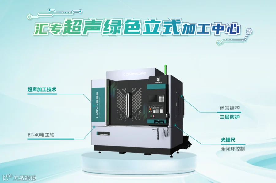 超声绿色立式加工中心UGV-856,同样配置汇专自主研发的智能化超声加工系统,同时配置高精密光栅尺,实现全闭环控制,重复定位精度达4μm。可选大转矩、大功率超声主轴,满足大切削量加工的需求。