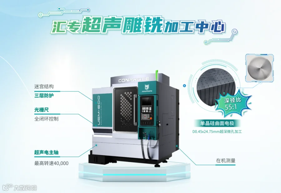 其中,超声雕铣加工中心UEM-600配置汇专自主研发的智能化超声加工系统,超声电主轴最高转速达40,000rpm,定位精度可达5μm,重复定位精度可达3μm,能够有效满足硬脆材料的高光、微小孔超声加工需求,帮助客户提升加工效率、降低设备成本,并带来更卓越的加工效果。