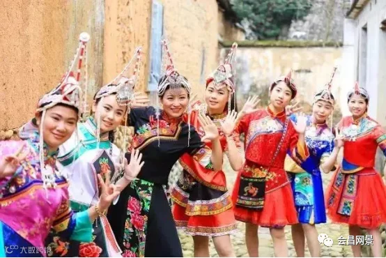 青蓝衣是畲族服饰特色、盘头和红绒绳是当地女性梳妆特点;舞狮、踩鼓、打癀、盘歌均为当地表演特色和少数民族特点。