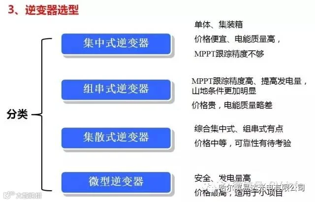 光伏逆变器主要分为:集中式逆变器、组串式逆变器、集散式逆变器、微型逆变器等。