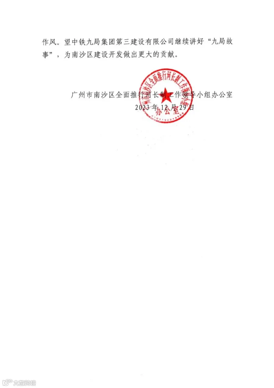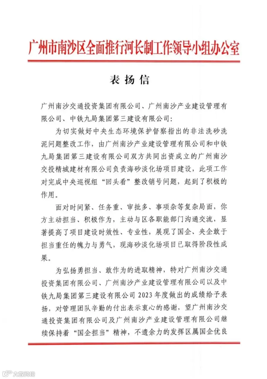 近日,公司收到来自广州市南沙区全面推行河长制工作领导小组办公室的表扬信,信中对公司以及海砂淡化场项目管理团队2023年度做出的成绩给予表扬,对全体成员辛勤的付出表示衷心感谢!