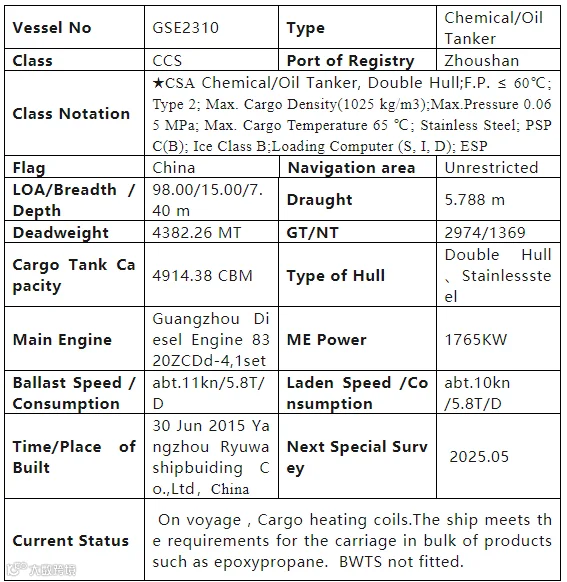 Commissioned by our entrusting party, Guangzhou Shipping Exchange Co., Ltd. (GSE) and Hang Qing Bao Auction Co., Ltd. determines to organize an online bidding for a 4,300DWT oil tanker numbered “ GSE2310”. The announcement is stated as follows.
