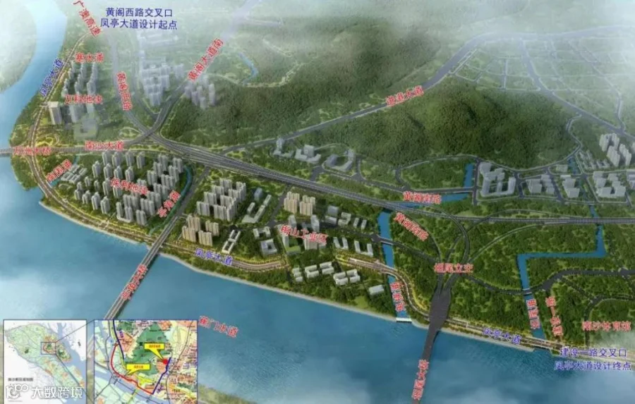 凤亭大道工程位于广州市南沙区亭角片区,起于黄阁西路与南涌口路平交口,终至现状凤亭大道东段,其中隧道部分全长599m,设计时速40km/h,双向6车道。