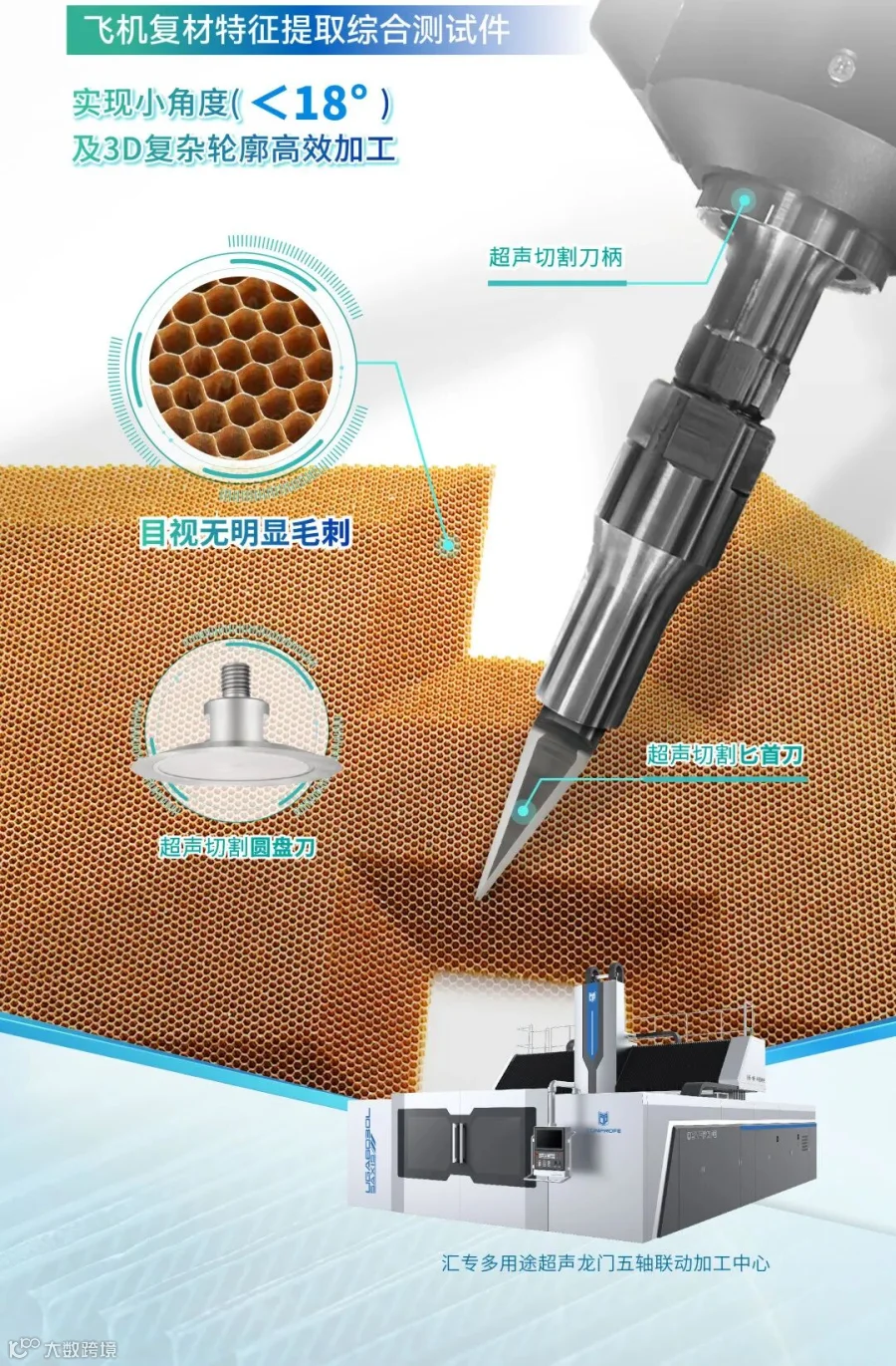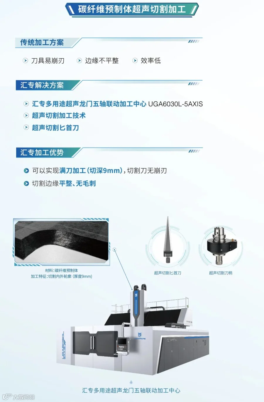 汇专三合一多功能复材龙门五轴加工中心UGA6030L-5AXIS,一机兼顾蜂窝材料、碳纤维预制体、碳纤维复合材料的高效高质加工,超声切割最高转速可达24,000rpm,而行业同类机床最高转速只有3,000rpm。