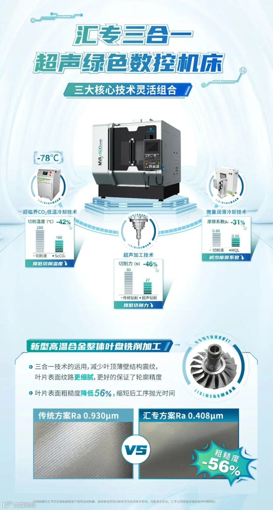 此外,汇专的三合一多用途超声绿色立式五轴联动加工中心灵活搭载汇专自主研发的超声、超临界CO2和微量润滑(MQL)三项技术,在加工过程中可使切削力降低46%、切削温度降低42%、摩擦系数降低31%。