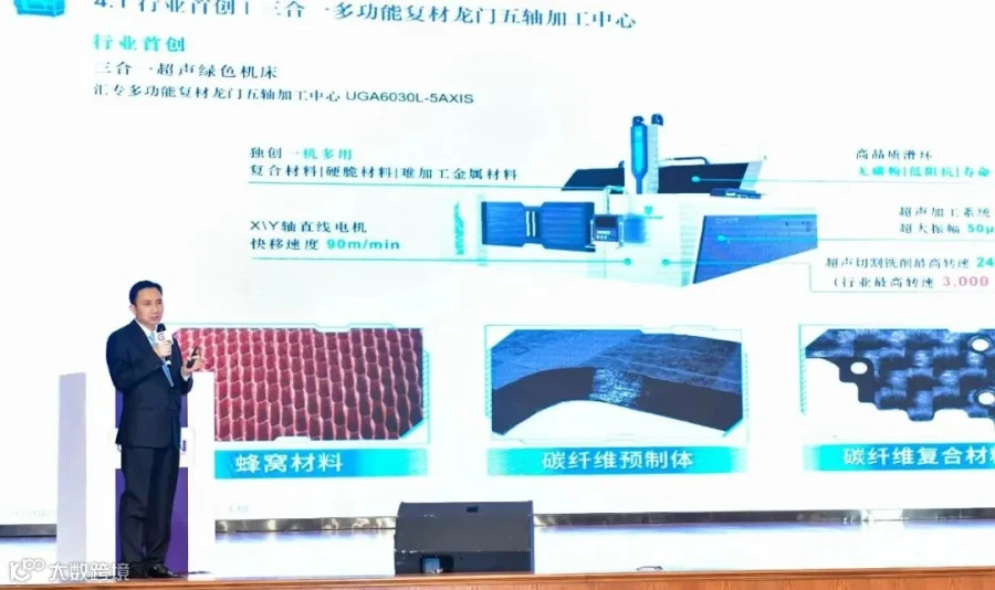 颜董事长介绍,作为高端超声绿色数控机床及关键部件研制商,汇专创造性地将超声及绿色技术与数控机床有机融合,研发出具有自主知识产权的超声绿色数控机床系列产品,针对先进复合材料、硬脆材料和难加工金属材料加工具备卓越优势,尤其在芳纶纸蜂窝、碳纤维预制体、碳纤维复合材料等材料中加工优势显著。报告还重点呈现了两款三合一机床和超声钻系列新产品,并通过多个具体案例分享,展示如何有效解决新型难加工材料加工难题。
