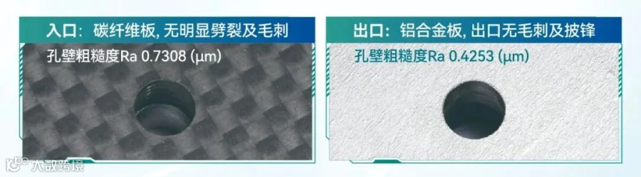 其中,使用超声气动进给钻对碳纤维铝合金叠层材料进行制孔,不仅有效提升孔的尺寸精度和圆度,还大幅降低孔壁粗糙度,入口(碳纤维板)无明显劈裂及毛刺,出口(铝合金板)无毛刺及披锋。