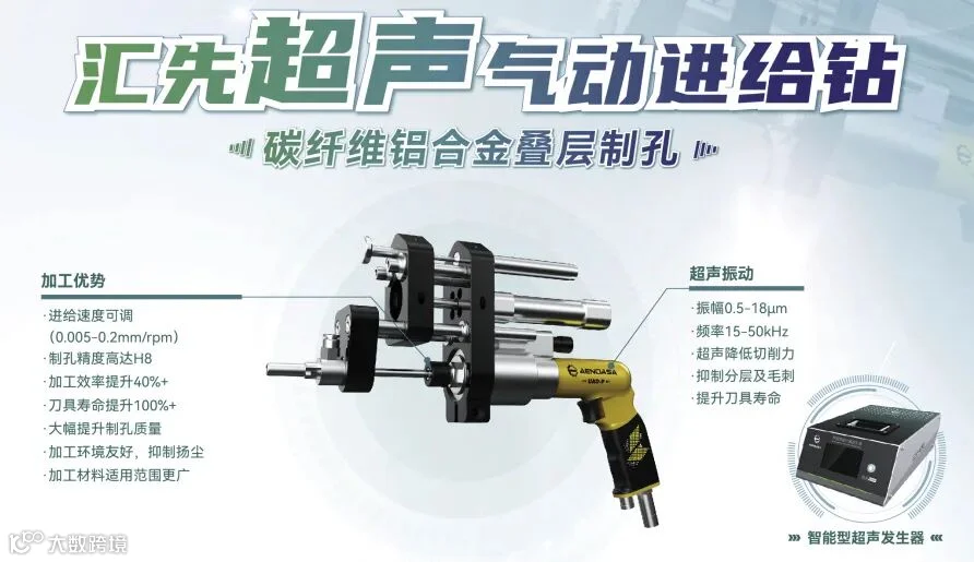 超声钻系列最新研发产品——超声气动进给钻,创新性地将超声加工技术与传统气钻相结合,有效解决航空航天飞行器装配制孔中的难题,具备降低切削力、抑制分层、减少纤维撕裂、延长刀具寿命、大幅简化工序五大优势,广泛应用于复合材料(碳纤维)、叠层材料(碳铝、碳钛、铝钛、碳铝钛叠层)及难加工金属材料(钛合金、高温合金)的高效高质制孔加工。