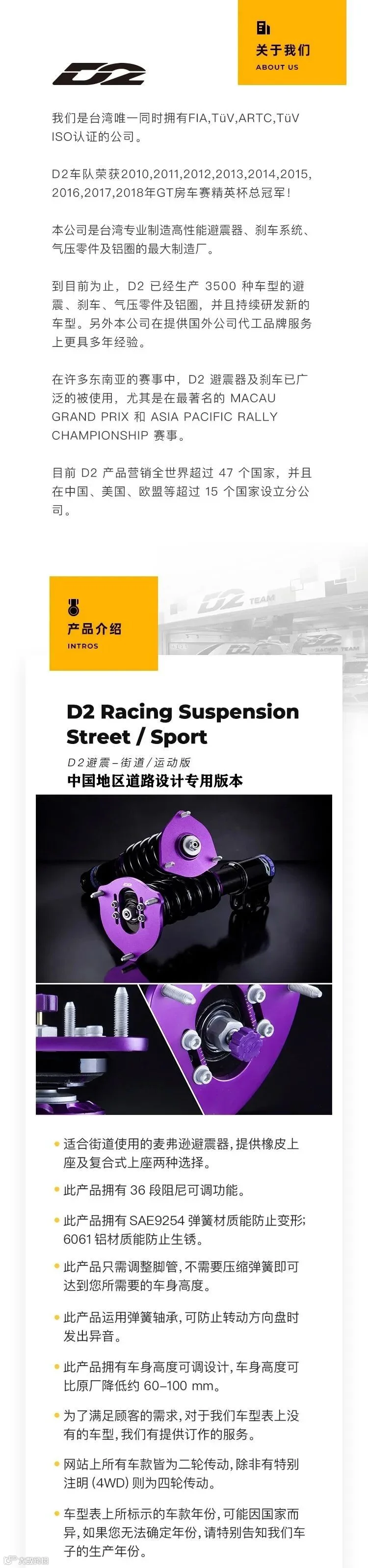本期D2RACING给大家带来这台 保时捷 Cayman 安装D2绞牙避震器(运动版),主要设计方向是针对车辆操作性的提升,拥有36段阻尼可调及车身高低可调,又兼顾了日常出行的需求。为了满足顾客的需求,对于我们车型表上没有的车型,我们有提供订作的服务。