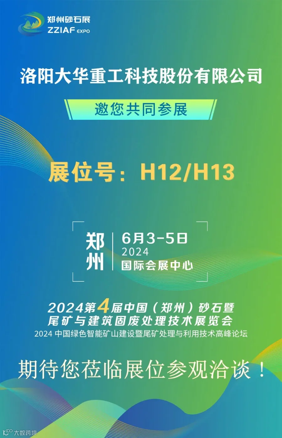 2024年6月3日至5日,一场瞩目的盛会——第四届郑州砂石展,将在郑州国际会展中心盛大启幕。这场展览,不仅是砂石行业的盛宴,更是技术与智慧的交融。洛阳大华重工将以其卓越的创新能力,为行业带来前所未有的震撼。我们诚邀您,共同见证这一历史性的时刻,相聚在美丽的郑州,相聚在郑州砂石展的H12/H13大华重工展位。让我们携手并进,共创绿色循环经济的辉煌未来!