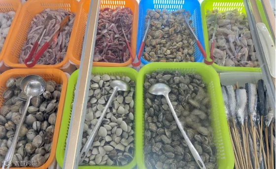 海鲜、肉类、青菜等各类丰富食材,让员工及家属们目不暇接。