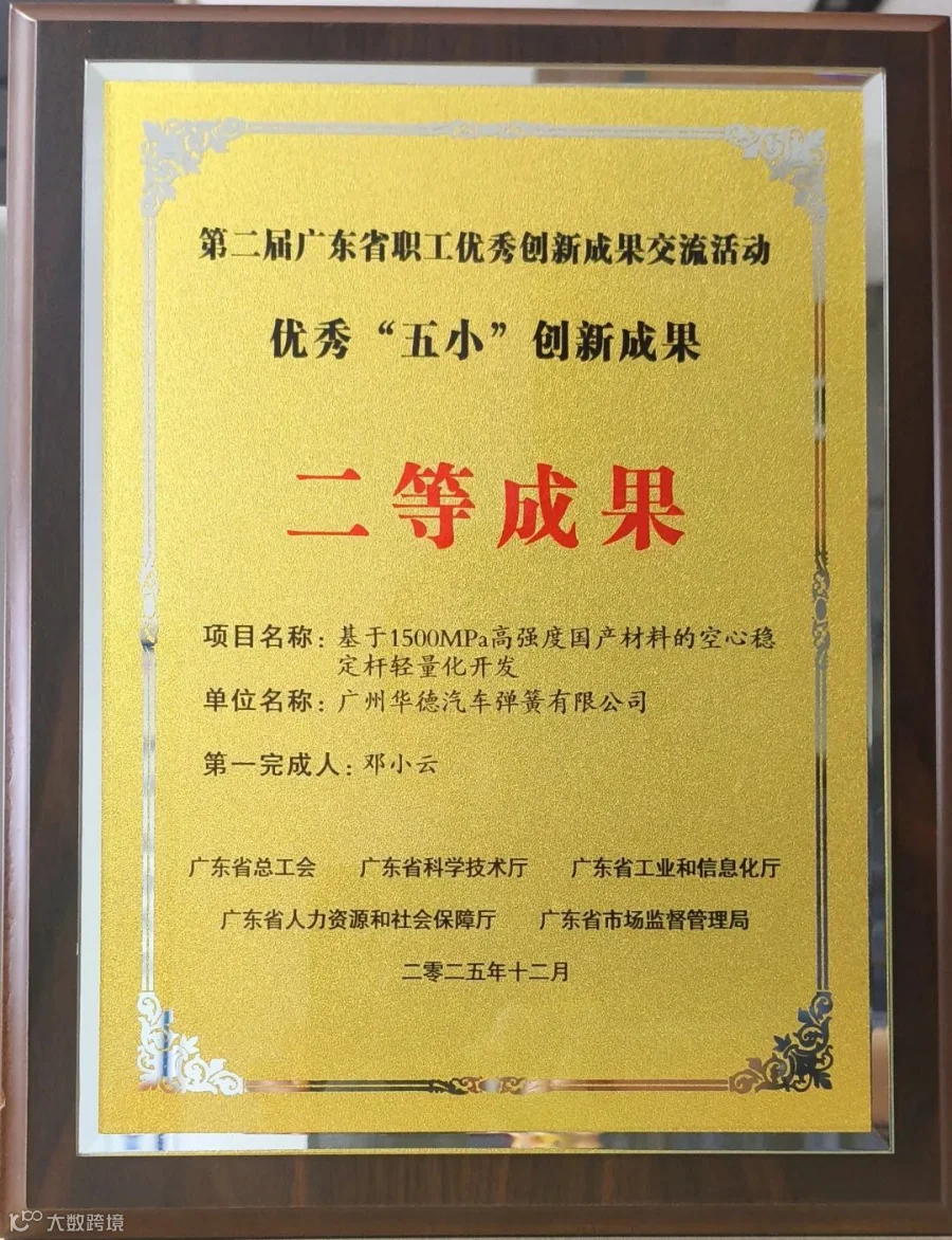 值此全面贯彻党的二十大精神、奋力谱写中国式现代化广东新篇章的关键历史节点,广州华德凭借卓越创新实力,荣膺第二届广东省优秀“五小”创新二等成果荣誉称号!该奖项由广东省总工会、广东省科学技术厅、广东省工业和信息化厅、广东省人力资源和社会保障厅、广东省市场监督管理局五大权威部门联合授予,彰显了广州华德在践行高质量发展理念、深耕专业领域方面的突出贡献,更是企业深化理解“十五五”规划的核心导向。