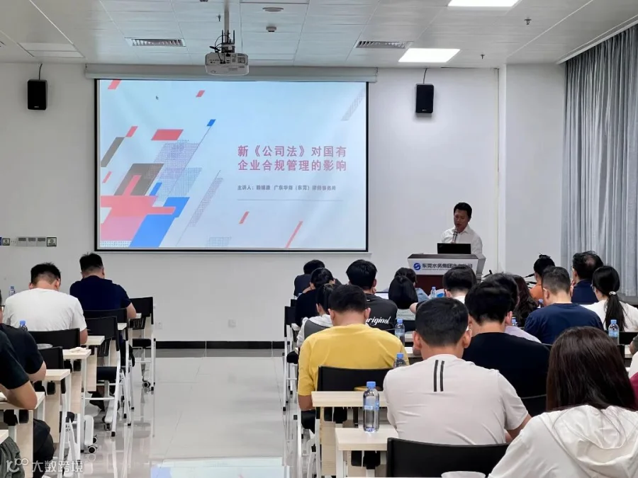 为适应新《公司法》所带来的新法律环境和要求,帮助公司领导干部深入理解新《公司法》的重要变化,切实推动公司合规管理水平提升,7月31日,东莞市水务集团净水有限公司举办了“新《公司法》对国有企业合规管理的影响”专题法律培训,邀请了广东华商(东莞)律师事务所的赖靖康律师为主讲嘉宾。