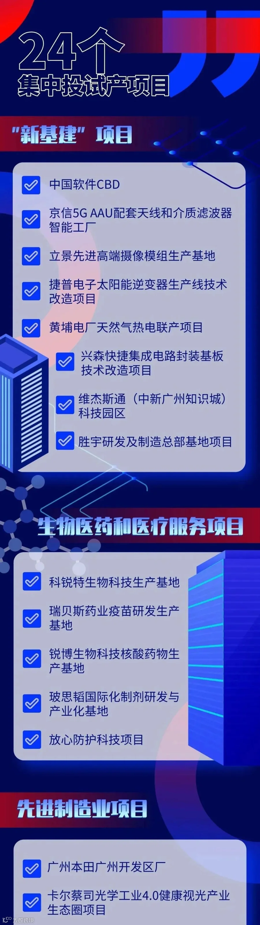 这24个集中投试产项目中,包含8个“新基建”项目,占当天投试产项目的33%。涵盖5个生物医药和医疗服务项目,7个先进制造业项目,4个总部和其他配套产业项目,预计达产产值(营业收入)约1172亿元,推动实现2020年第一季度经济发展开门红。
