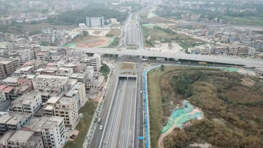 九龙大道主线采用双向六车道下沉隧道,广汕路主线采取双向六车道跨线桥,并设置2座人行过街通道。该工程地处省道与国道的交通咽喉,建设施工环境十分复杂,面临着建设用地交地、管线迁改(军用通信线)、地铁交叉施工、交通流量大等多方面压力和困难。