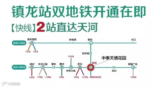 中泰天境花园坐拥地铁21号线(建设中)、地铁14号线(建设中)以及穗莞深城际轻轨(建设中),项目紧邻镇龙地铁站,双地铁开通在即,穗莞深城际轻轨年底开通,快线2站到天河区、6站到珠江新城。