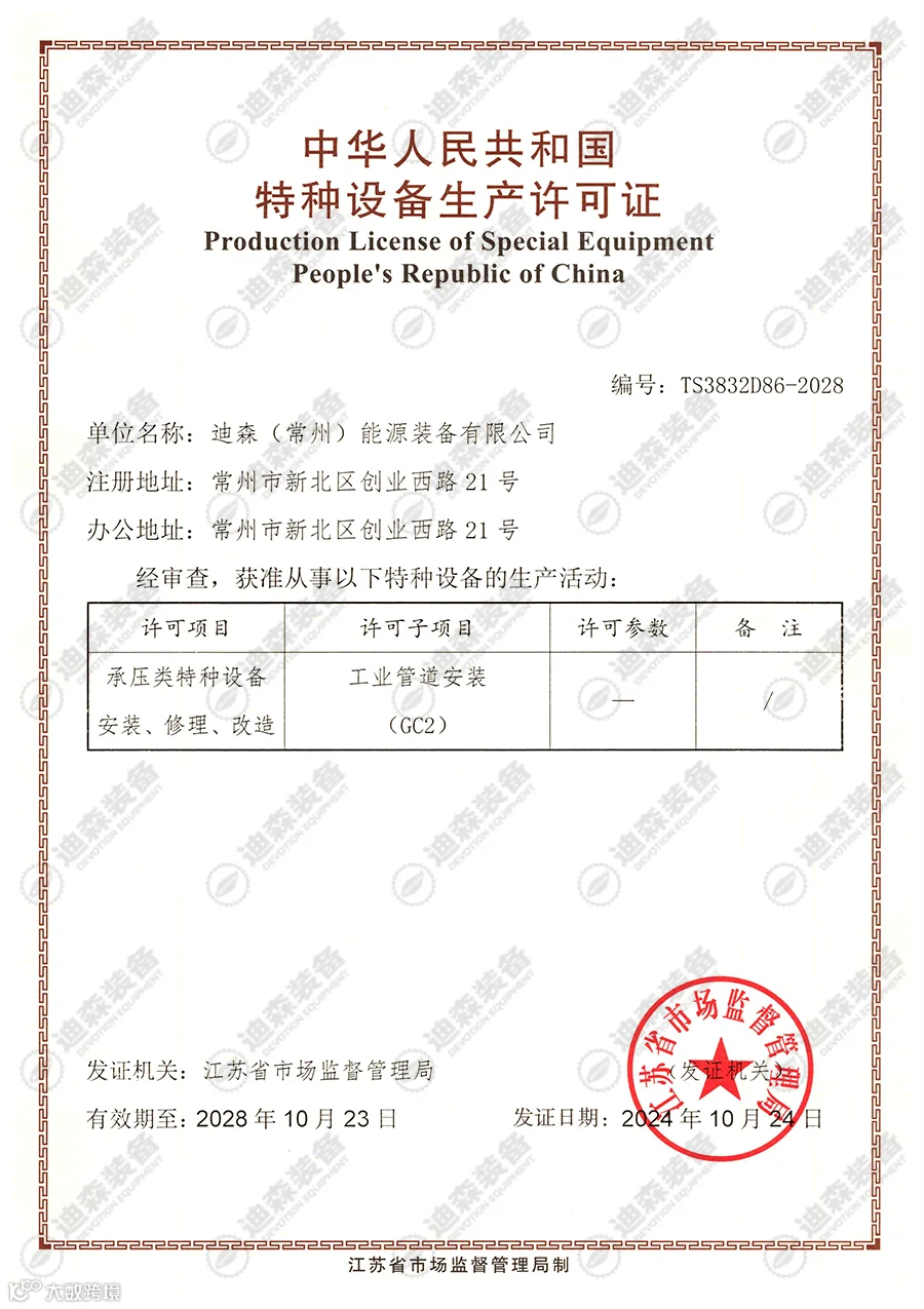 10月24日,经江苏省市场监督管理局核准,迪森(常州)能源装备有限公司获批“承压类特种设备安装、修理、改造-工业管道安装(GC2)”许可证,标志着公司由单一设备供应商向工程建设集成商迈出了重要的一步。