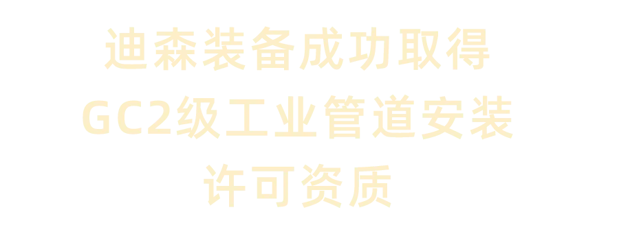 获得GC2级工业管道安装资质,是对迪森装备压力管道安装实力的充分肯定,标志着公司在压力管道安装相关业领域已具备成熟专业的技术人员、设备工具及管理体系。