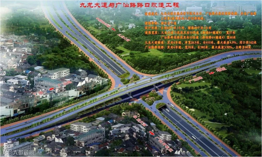 项目紧邻九龙大道与广汕路立交,该工程为九龙大道设置直行隧道下穿广汕路,广汕路上设置直行高架桥上跨九龙大道。其建成后将使知识城与科学城的联系更加频繁,有效实现两个重点发展区的良性互动。