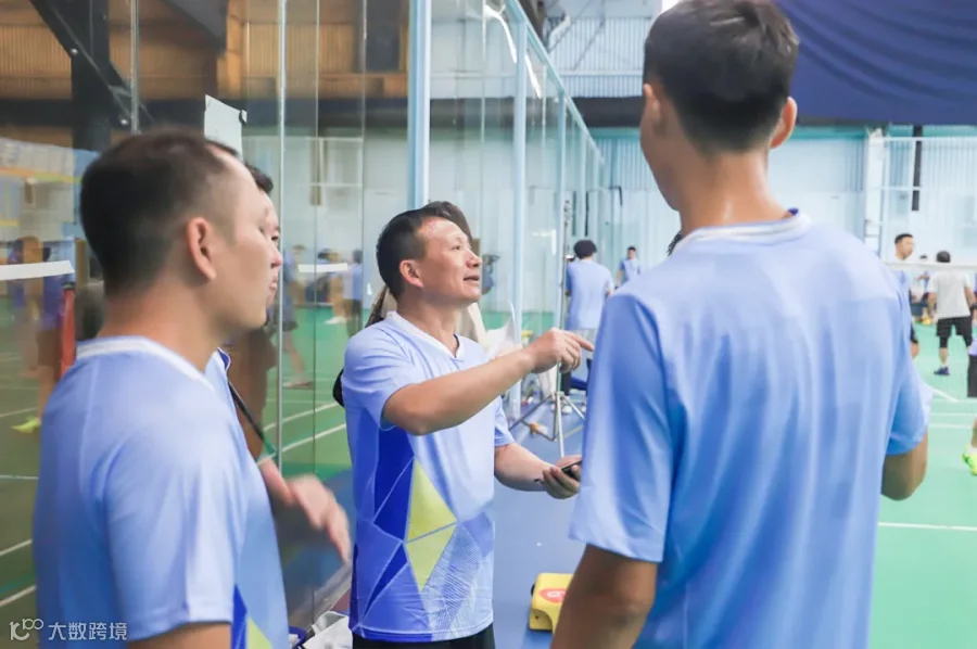 领队邓光辉(戴卡旭)与队员们讨论战术