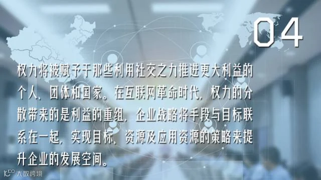 网络革命使得国家与国家、政府与政府之间的权力逐步缩减,同时使到企业与个人在公共管理的能力上逐步提升。这将会为个人和企业的软实力在更大空间范围的发挥作用,这对企业来说是更多的市场机遇。