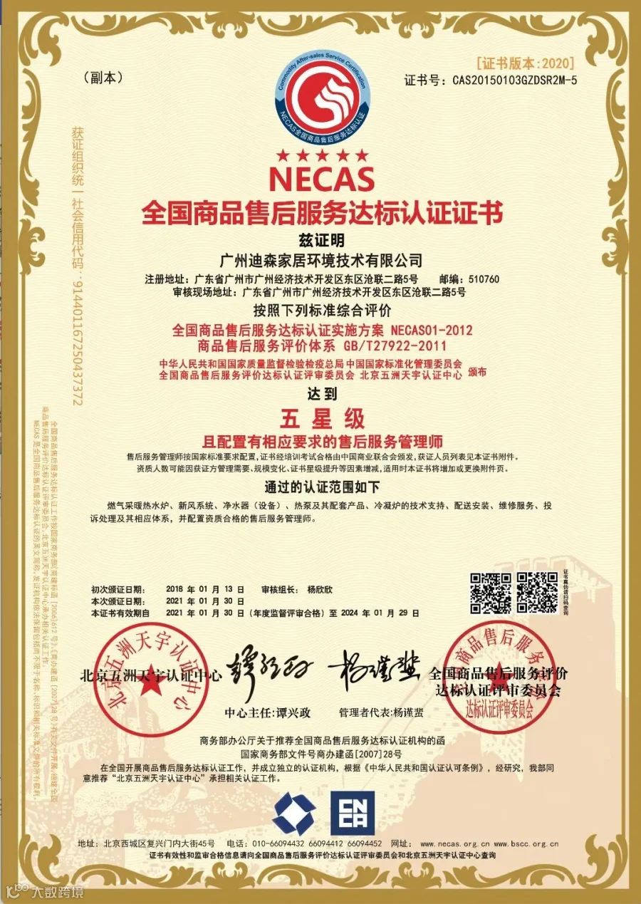 2021年1月,历经严格审核,广州迪森家居环境技术有限公司(以下简称“迪森家居”)再获“五星级售后服务认证”。五星级是售后服务认证中的高评级,彰显了迪森家居在全国全行业范围的服务领先性与创新性。