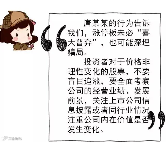 如果没有“基本面”的支撑,股价突然涨停,此中恐有蹊跷。一旦落入违法者设下的“陷阱”,将遭受严重的损失。因此,投资者应当树立并坚持价值投资的理念。规避损失的一个重要方法就是不盲目追涨,不参与市场过度恶炒,形成良好的投资习惯,妥善管理和防控投资风险。
