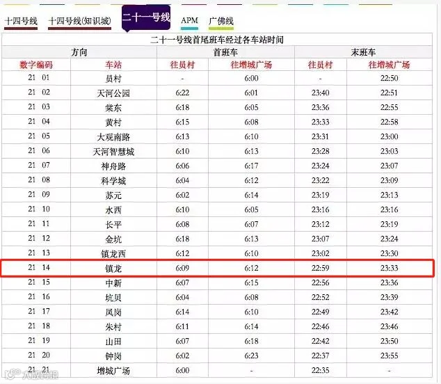 处于中间的换乘站镇龙,往员村的尾班车是22:59,往增城广场的尾班车是23:33。