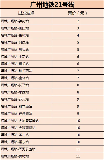而最新票价也已新鲜出炉,21号线全程最高票价为11元,计算可知镇龙站到员村参考票价为5元(以广州地铁app最终公布价格为准)。