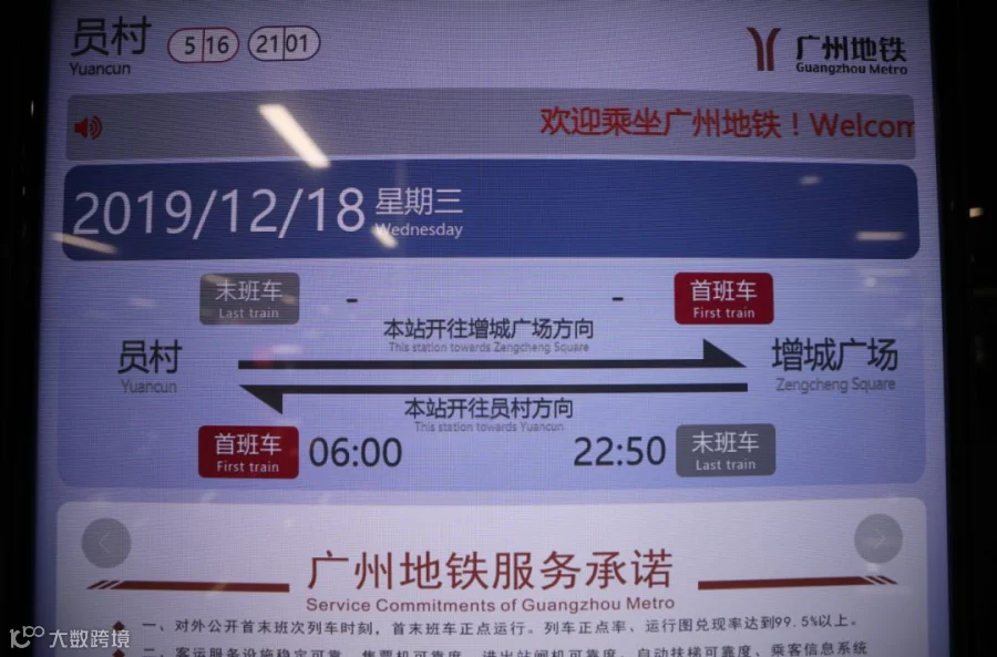 地铁二十一号线的员村站头班车6:00,尾班车22:50。增城广场站头班车6:00,尾班车22:35。