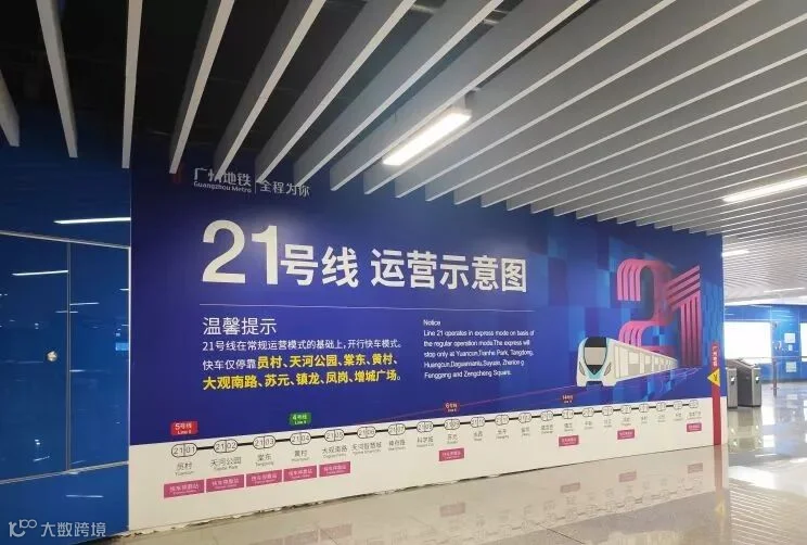 二十一号线全长61.5公里,自西向东贯穿天河区、黄埔区和增城区,西起天河区员村站,止于增城广场站,共设21座车站。