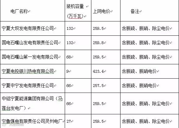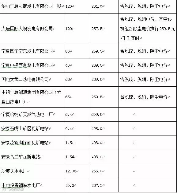 宁夏自治区发电企业上网电价表(单位:元/千千瓦时)