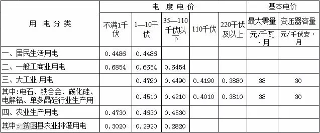 注: 1、上表所列价格除贫困县农业排灌外,均含国家重大水利工程建设基金0.4分钱和农网还贷资金2分钱;除贫困县农业排灌和农业生产电价外,均含大中型移民后期扶持资金0.16分钱;除农业生产、贫困县农业排灌、青铜峡铝厂一、二期电解铝生产电价外,均含城市公用事业附加费1分钱;青铜峡铝厂一、二期电解铝生产用电2分钱农网还贷资金暂缓征收。