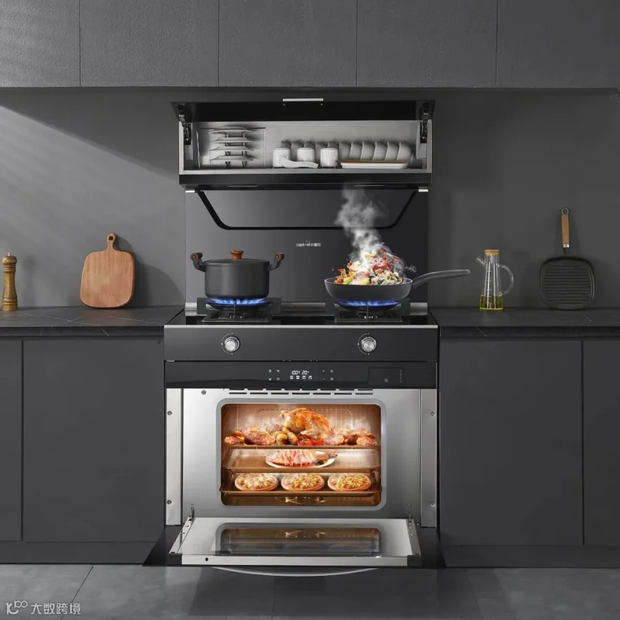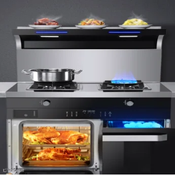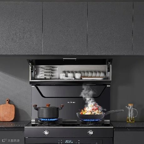 目前行业主流的集成灶都是传统4合1集成,即“吸烟”、“爆炒”、“鲜蒸”、“嫩烤”一体化集成,在烹饪效率上给用户带来很大的提升。但在空间利用上,以及烹饪需求上仍存在一些不足。如:集成灶到吊柜的空间未被合理利用;冬日里烹饪,未等开餐,饭菜已凉等。