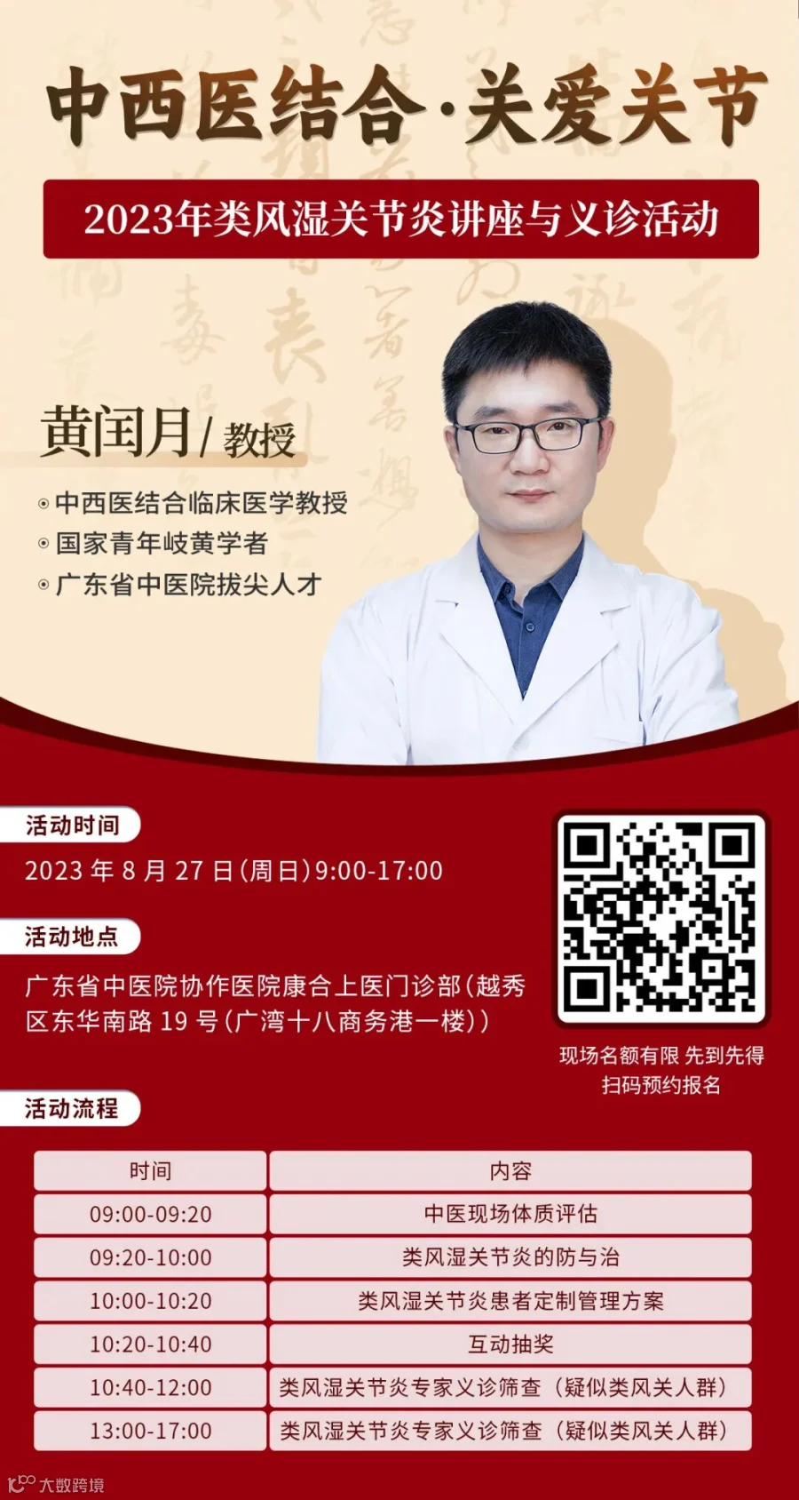 现可参加广东省中医院黄闰月教授团队的免费义诊筛查活动,也鼓励陪同疑似类风关的家属朋友前来义诊筛查,经医生评估如果符合条件,可获免费检查。