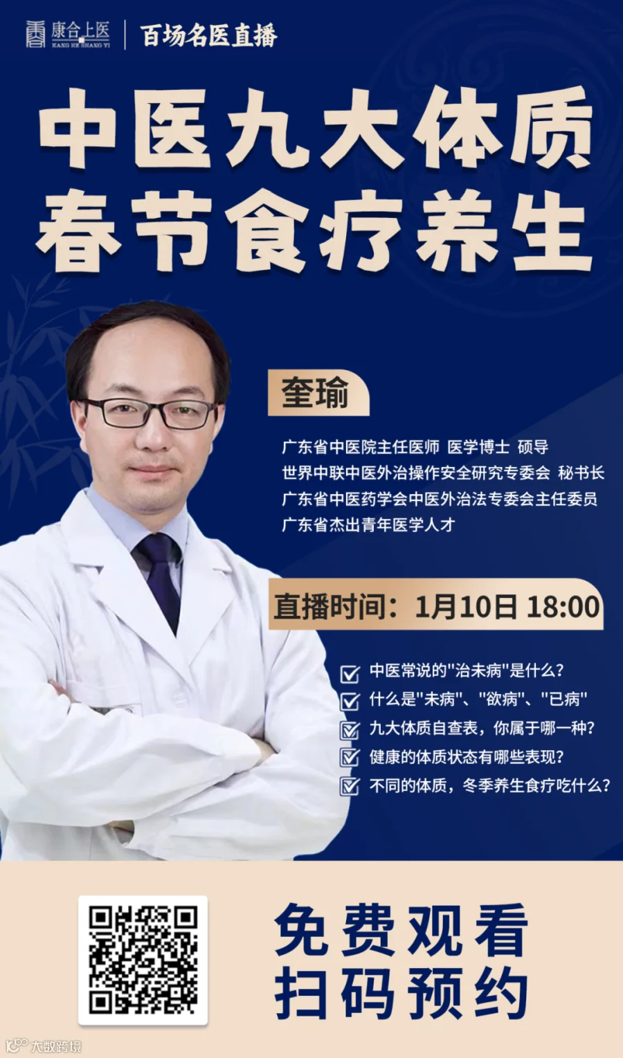 🌟本周五(1月10日)晚上18点,广东省中医院奎瑜主任以“中医九大体质辨识”为主题,进行线上直播分享,讲解九种体质的表现特征与调理方向。