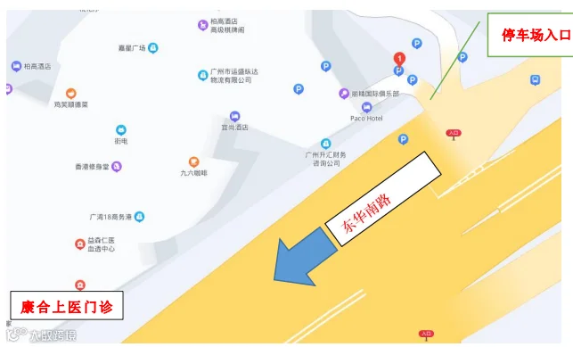 康合上医门诊部地下停车场,电梯直上1层到门诊一楼扫码后看诊。