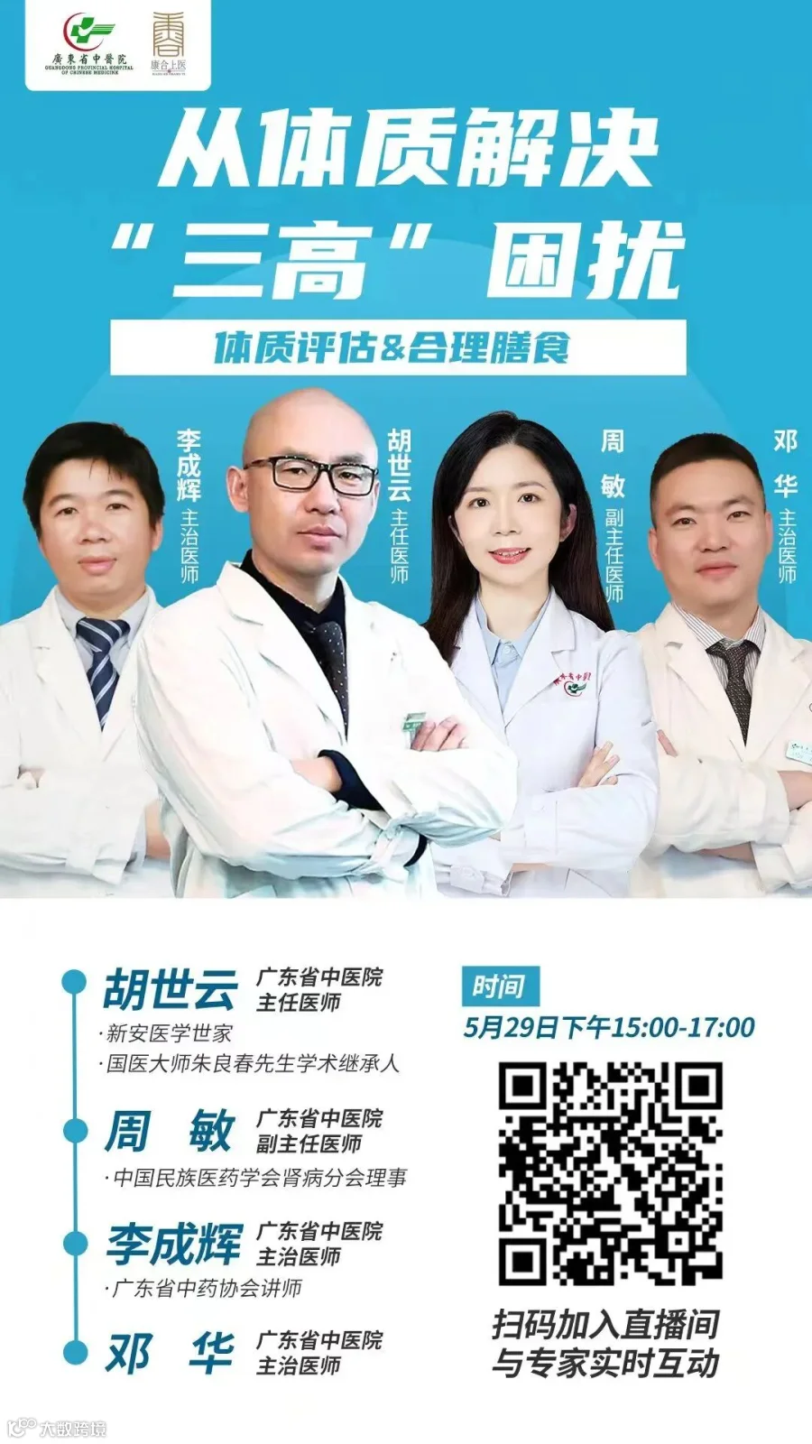 5月29日下午15:00-17:00,广东省中医院胡世云主任医师、周敏副主任医师、李成辉医生以及邓华医生将在线教你如何从体质解决“三高”困扰!