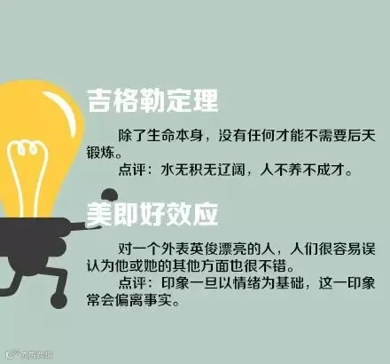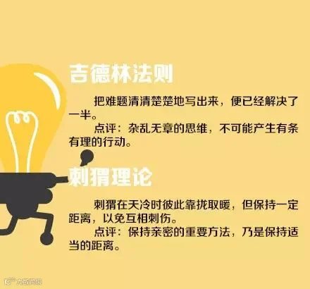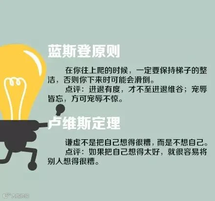 【18个定律助你成功】①蓝斯登原则:在你往上爬的时候,一定要保持梯子的整洁,否则你下来时可能会滑倒;②吉德林法则:把难题清清楚楚地写出来,便已经解决了一半;③刺猬理论:刺猬在天冷时彼此靠拢取暖,但保持一定距离,以免互相刺伤……18个定律,给追求成功的你!