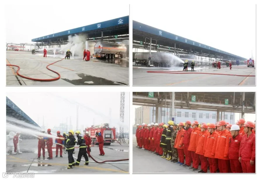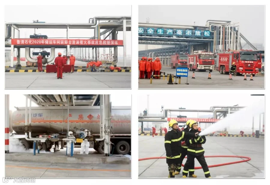演练:装车台操作工装车期间发现汽油装车42#口突然起火,情况紧急需要救援。车间操作工用对讲机报告班长同时利用现场火灾报警按钮向消防队报警,一系列救援工作迅速展开。