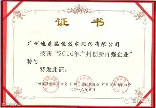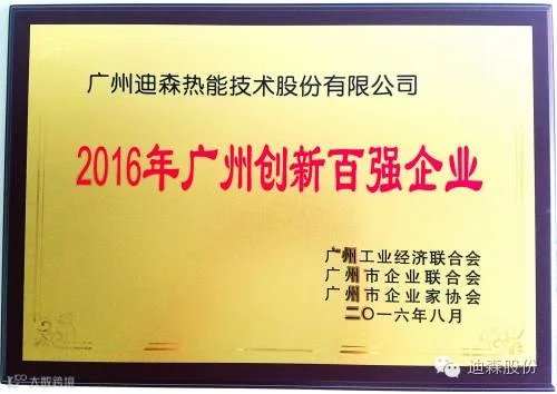 2016年8月29日,迪森股份受邀参加了由广州“三会”(广州工业经济联合会、广州市企业联合会、广州市企业家协会)在广州白云国际会议中心举行的2016年广州企业家年会暨颁奖盛典,并荣获 “2016年广州创新百强企业”称号。