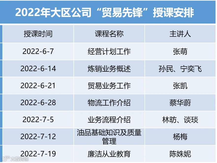 为全面匹配石油销售公司“自营+平台+服务”战略,深入践行“全过程”人才培养理念,统筹强化实战化培训体系建设,聚焦专业人才队伍业务能力提升,大区公司根据2022年度培训计划,于6月份组织开展“贸易先锋”第二阶段线下培训活动。在“贸易先锋”第一阶段线上培训的基础上,本次培训结合2022上半年度工作进展和下半年度工作重点,对课件进行优化调整,邀请各部门讲师现场授课,进一步提升企业培训质量。