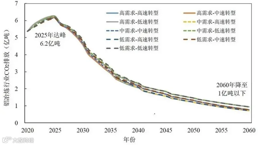 图9 铝冶炼行业未来CO2排放路径(2020—2060年)