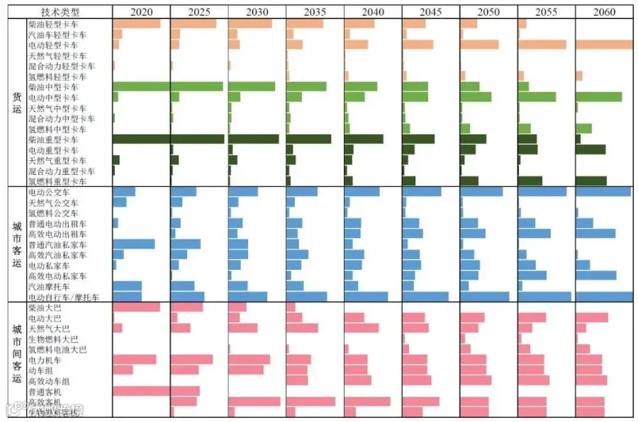 上述碳排放路径下,各类运输设备都应向着燃料高效化、清洁化、电动化的方向发展(图16)。对于城市间客运而言,公路运输中的柴油客车逐渐被电动客车替代,应在2040年退出市场;到2060年,电动小汽车和氢燃料电池车的渗透率应分别达到55%和9%以上;到2050年铁路客运应争取实现100%电气化;就航空客运而言,生物航空燃料应最晚于2025年进入航空市场,到2060年,至少50%的航空运输服务由生物燃料飞机提供。对于城市客运而言,应重点推广电动私家车与出租车,到2060年渗透率应分别达到85%以上;柴油公交车应在2060年前全部淘汰,纯电动公交车2060年占比应至少达到95%;对于货运交通的技术布局,2020年货运道路交通使用的燃料以柴油和汽油为主,到2060年则主要被电力和氢燃料替代;轻型、中型卡车到2060年以电动车为主;2030年逐步推广氢燃料重型卡车和电动重卡的规模化应用,到2060年渗透率应分别达到45%以上;2020年水路货运以燃料油为主要能源,2060年生物燃料船舶应在水路货运中占有重要地位。