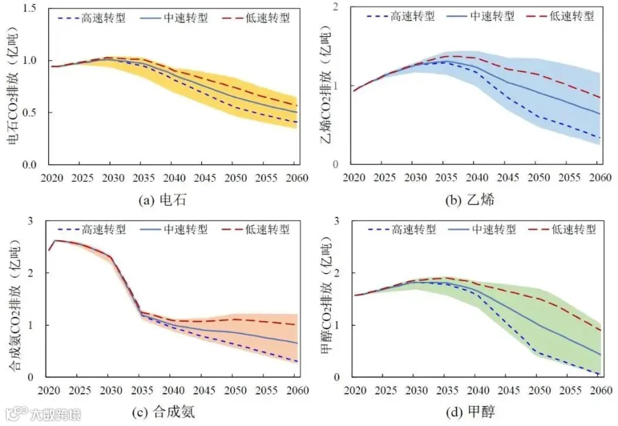 未来关键化工产品需求将持续增加,致使碳减排面临严峻挑战。在经济增长相对平稳的中需求情景下,2060年乙烯需求将达到6923万吨,而若经济增长速度更高和更低时,则其需求将分别为9617万吨和4880万吨左右。受未来产业结构中第一和第二产业占比逐渐下降影响,合成氨需求将总体呈现下降趋势,到2060年,在高、中、低需求情景下将分别下降至2900万吨、2419万吨和2054万吨。电石和甲醇作为重要的大宗基础化工品且位于产业链的上游,在经济发展和社会经济转型的双重作用下,其需求将呈现总量增长、增速放缓的趋势。2060年时,甲醇需求在0.985~1.32亿吨,电石需求为4745~6371万吨。