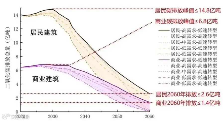 建筑部门包括公共建筑和居民建筑。在建筑运行阶段需要提供采暖、制冷、热水、炊事、照明等能源服务,由此产生大量的直接碳排放和间接碳排放。未来随着人均收入的增加以及人均建筑面积的增长,预计建筑部门运行阶段的能源服务需求将由2020年的13.1亿吨标准煤持续增长至2060年的26~31.6亿吨标准煤。其中,居民部门能源服务需求由2020年的7.3亿吨标准煤增长至2060年的11.5~14.6亿吨标准煤。商业部门能源服务需求增速较居民部门更高,由2020年的5.8亿吨标准煤增长至2060年的14.4~17亿吨标准煤,增长1.5~1.9倍(图14)。在满足能源服务需求的前提下,为了低成本实现全国“双碳”目标,居民建筑部门碳排放峰值需控制在14.8亿吨CO2以内;商业建筑部门碳排放峰值不超过6.8亿吨CO2;建筑部门累计CO2排放需在2027—2030年达峰,各种情景下,峰值不超过22亿吨CO2。