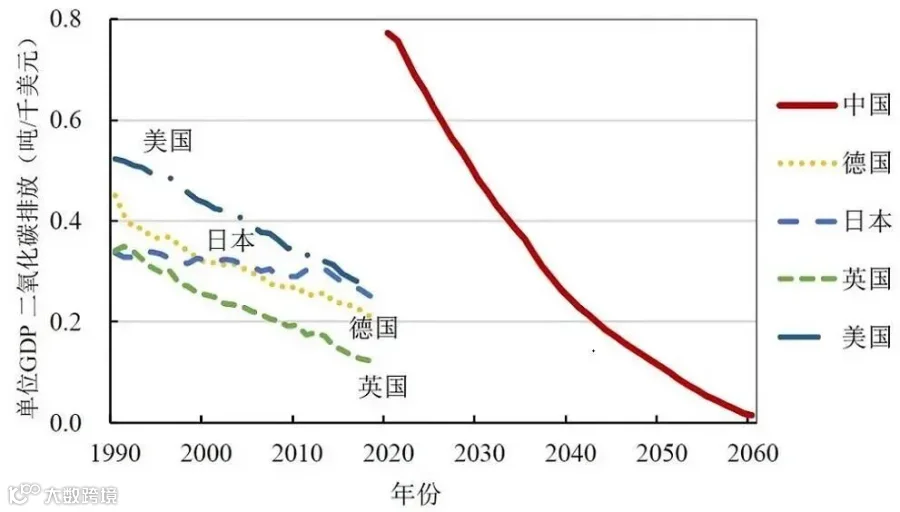 图4 中国与主要发达国家单位GDP二氧化碳排放量对比