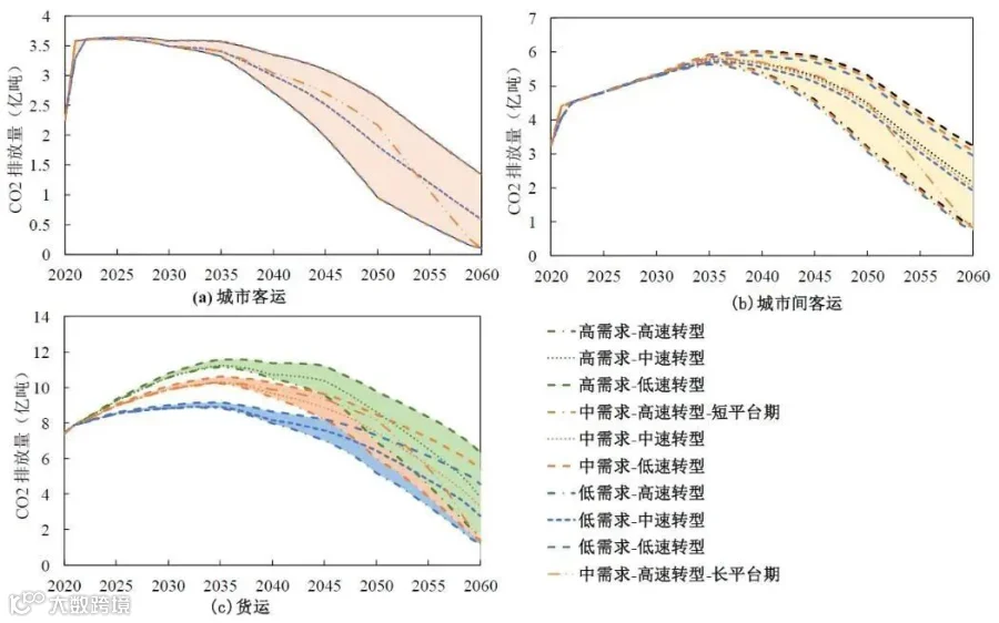 为了满足全社会交通运输服务需求并低成本实现全国碳中和目标,城市间客运交通CO2排放量需在2035到2039年间达峰,峰值控制在5.6-6亿吨CO2,但由于部分传统技术难以被替代,到2060年将仍可能存在0.8-3.2亿吨的CO2排放。城市客运交通CO2排放量需在“十四五”末或“十五五”初达峰,峰值控制在3.7亿吨CO2左右。货运交通CO2排放量需在2035年前后达峰,峰值不超过12亿吨CO2,到2060年仍可能存在1.1到6.3亿吨的CO2排放。从交通部门整体来看,需在2035年前后达峰,峰值约为17.8~22亿吨CO2。相关碳排放路径如图15所示。